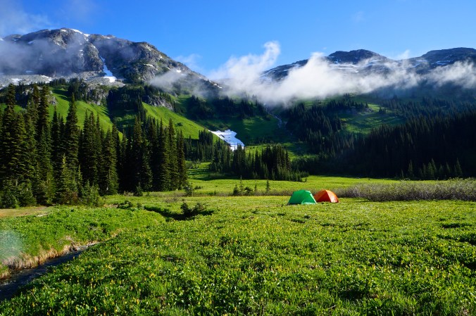 Despite the shoddy weather though, I absolutely loved Tenquille Lake. I’ve come to appreciate this trail more since I was first there because it really is the perfect mix of alpine lakes and alpine meadows. Alpine meadows have become pretty much my favourite backcountry scene, and Tenquille has both the lake, surrounded by mountains, and the alpine meadows next to the lake. This was also one of the rare backcountry hikes I’ve done since I moved here where we were actually permitted to have a campfire. Most provincial parks prohibit campfires in the wilderness and by early July, we’re usually into full fire ban, but this was one trip where we went early enough to have a campfire. I’m realizing now that Brandon must have carried an axe up there on top of all his other gear, so thanks again Brandon!