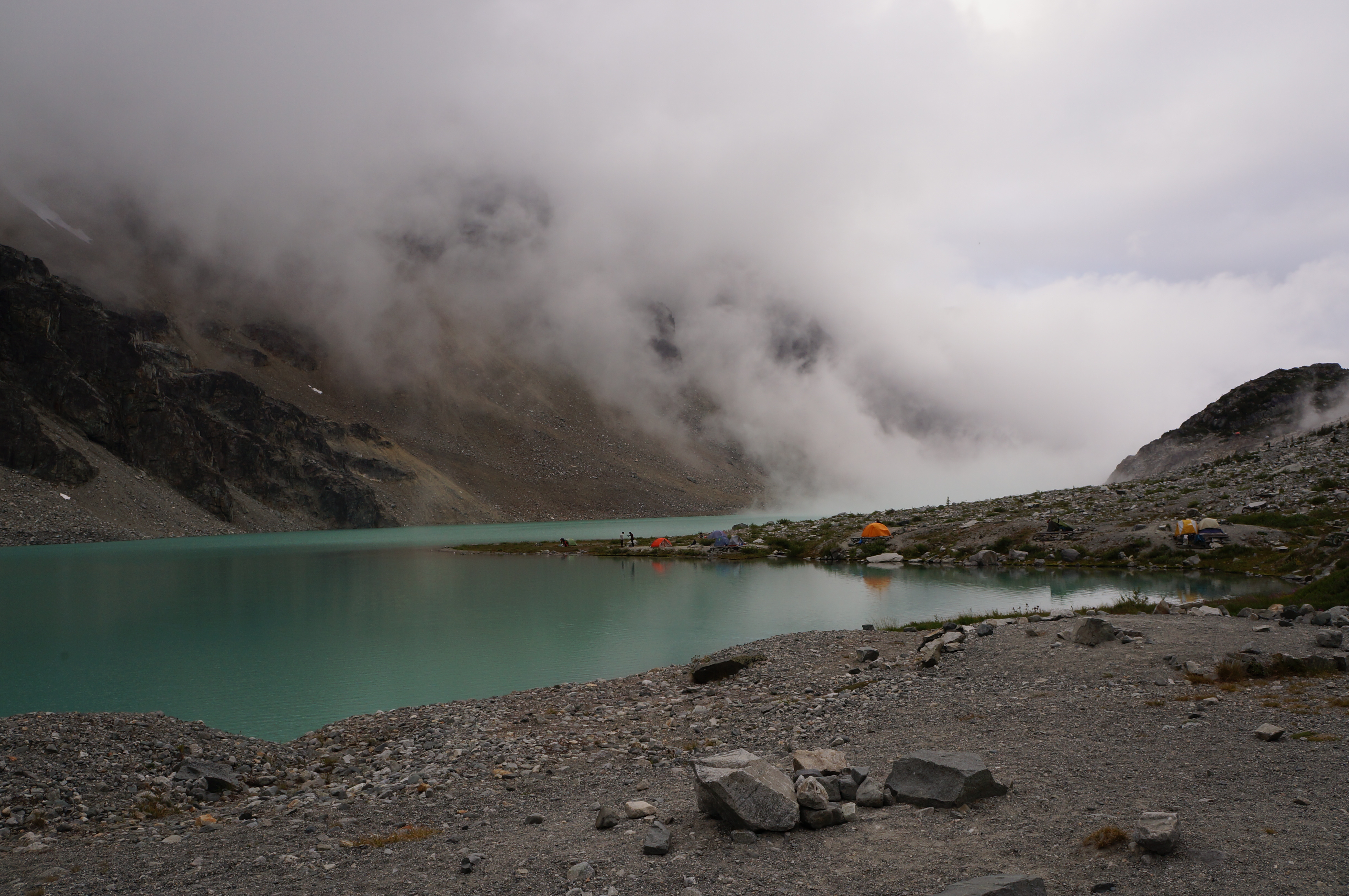 When you get to the top of the landslide, you’re in a valley of sorts, with Wedgemount lake at the bottom, surrounded by another set of peaks and the Wedgemount glacier. You hike down into the valley, which is completely wide open with very little shelter. Over the years, people have moved the rocks around to create little rock-walled campsites to protect from the wind that funnels in through the valley across the lake. There is a small hut up there as well, but I think most people opt to camp as there’s tons of space up there and lots of sites to choose from.