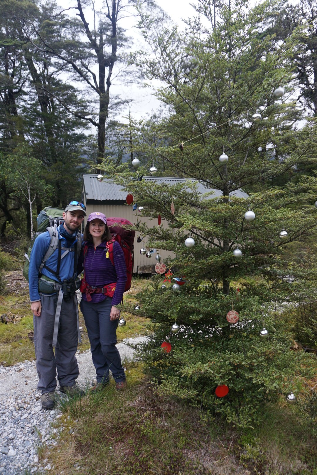 But we experienced a lot more on the trail then just predator control. Before we’d even heard about the whio success story Seth had decided that the blue duck was what he really wanted to see on the trail. So of course, despite the claims of all the whio, we didnt see any on our first two days. While day 1 was a short day on the track, we paid for it on days 2, 3, and 4. We hiked 16.5km on day 2, which was also Christmas Day! It was a much different Christmas than we’re used to, but we did get to help the ranger decorate one of the trees by the hut for the occasion. Christmas Day was also mostly in the valley, though we had much more dramatic peaks rising on both sides of us. It was an overcast day and the very tops of the mountains were lost in the clouds, but it didnt rain and overall it was pretty good weather for hiking. I decided to make a tradition of my river swim and went for another dip in the river when we made it to Mintaro Hut.