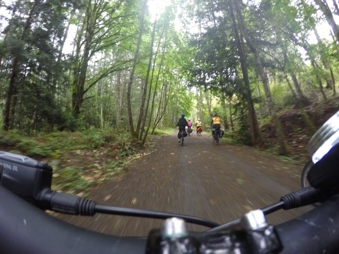 Fortunately, the rain finally stopped while we were in Tim Horton’s and stayed away for the rest of the ride. So we had a quick bite to eat at Tim’s and then took off again, this time being able to stay dry. The Galloping Goose from Langdale to Sooke was definitely the highlight of the trip for me. Until then, we were mostly riding on side road bike paths or in many cases, just bike lanes. But after Langford, the Goose changes to a wide forested trail for the rest of the ride. We were able to ride long distances without having to worry about any road crossings and the trail was wide enough that the girls could ride two abroad and chat.