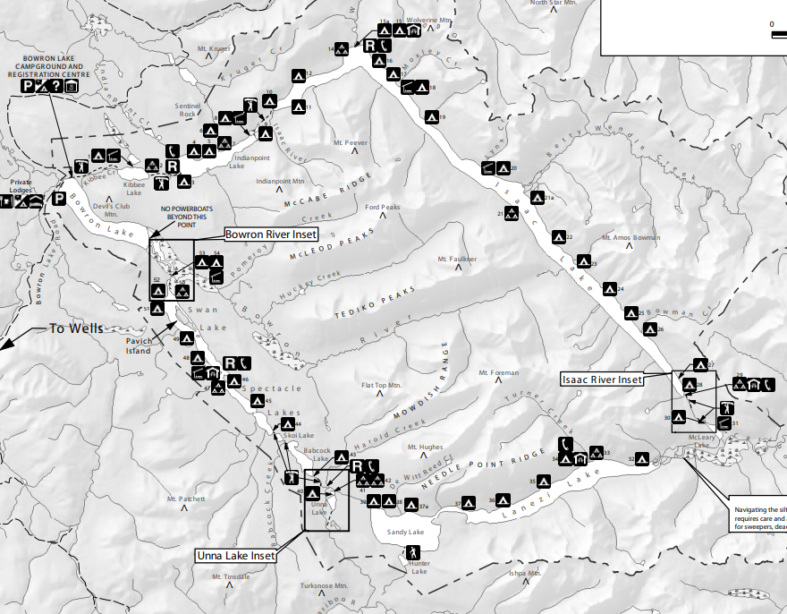 Eventually we arrived at Isaac Lake, the biggest lake on the circuit. I think it’s time to share a map of the circuit to give you an idea of the unique topography of this area. The circuit is very rectangular, with Isaac Lake having a notable corner in it. The west arm is ~7km long, while the main arm is ~31km long. We paddled Isaac Lake for 2 full days and it is definitely one of the more memorable lakes (both good and bad).