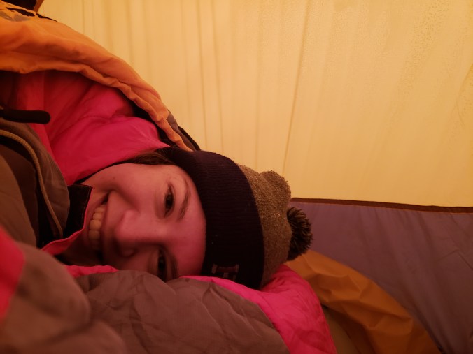 I take my blanket into the sleeping bag with me (it’s warmer this way and less likely to fall off) and then to finish it off, I overlay my parka over my middle/butt area because I’m a side sleeper and line my snowpants between my bag and the tent to avoid a draft and stay insulated if I accidentally touch the side of the tent. With my new bag, I’m able to leave the liner and blanket at home. It can take a while to get warm in the sleeping bag because it takes a while for your body to heat the space. Try doing sit-ups in your bag right after you get in to warm it up. As a side sleeping, I also recommend starting on your back (it’s warmer this way because your sleeping pad reflects your body heat back at you), then switch to your side once you’re toasty warm.