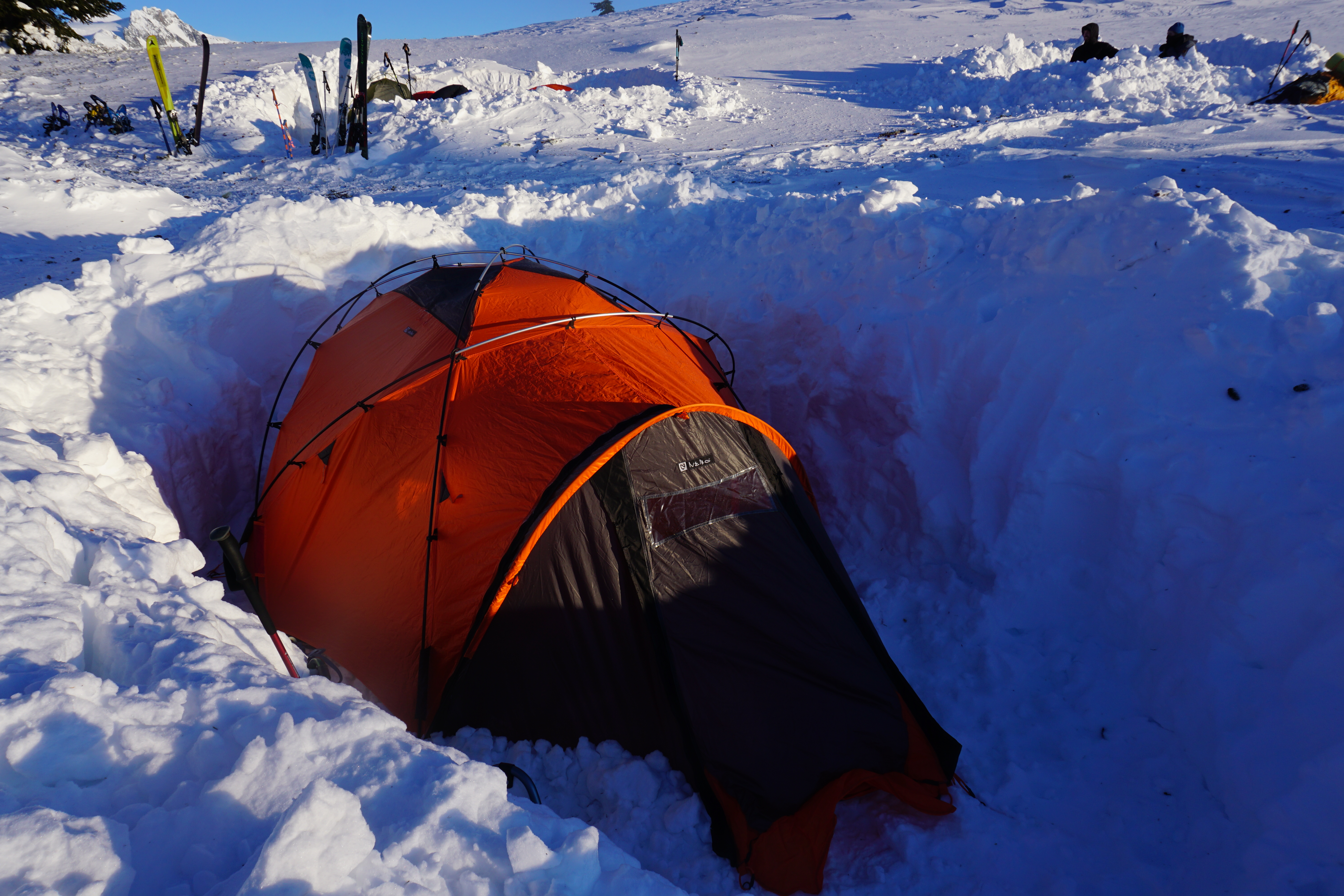 We have also tried snow camping in a 3 season tent. It’s not ideal, especially if it’s really cold, but if you pack the sides of the tent with snow for insulation, it’s actually not too bad. We made sure to pack the snow up so that it closed the gap between the fly and the inner tent to avoid a draft, but because most 3 season tents are made of mesh, it’s unavoidable that it will be cooler than a true winter tent. Finally, make sure you fill in your hole at the end of your trip to avoid creating a hazard for future users. If the hole fills with powder, it may confuse a skier and could easily result in a broken leg if they don’t know it’s there.
